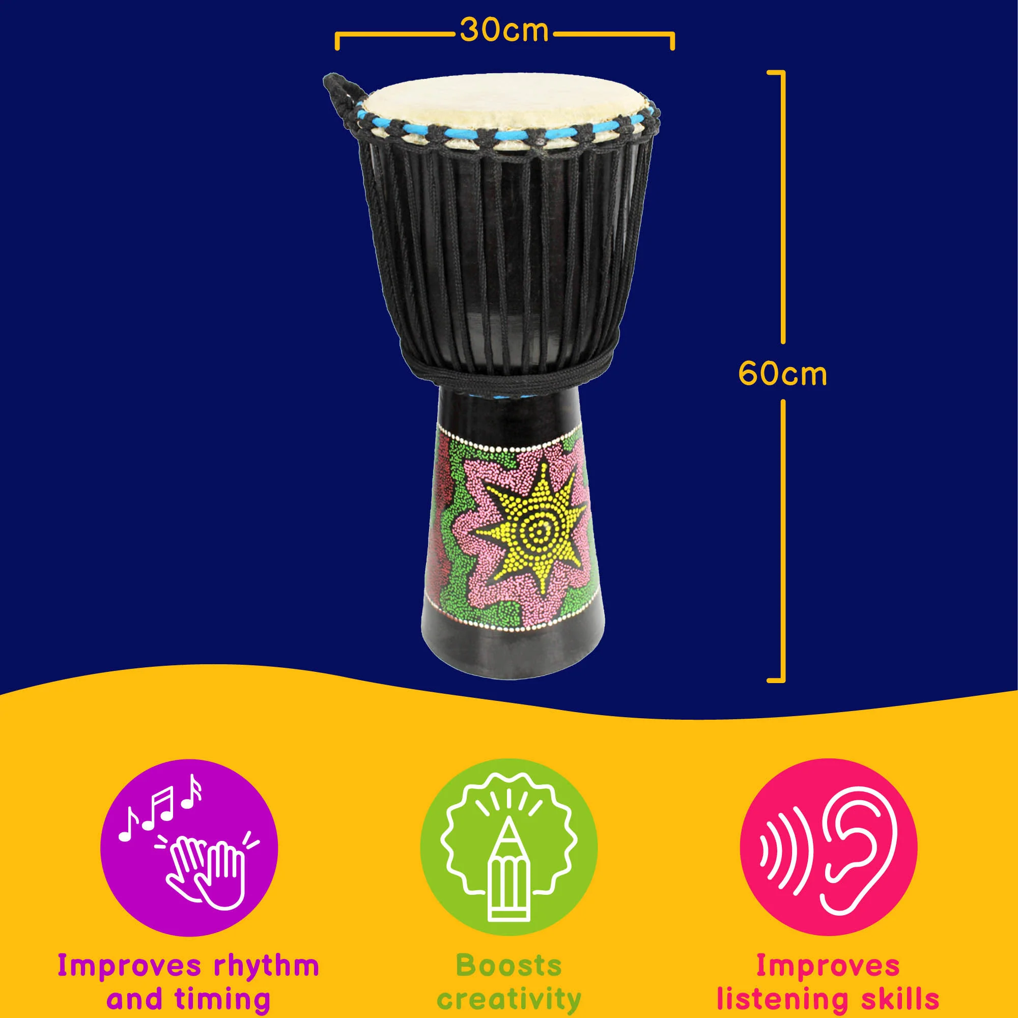 Introducing our most popular 10 inch A-Star djembe (pronounced jem-bay). The djembe is one of the world’s most popular drums that is now a mainstay within schools and education, promoting the sounds and cultural diversity of African and world music. Traditionally hand made using high quality solid wood and featuring natural goatskin heads and rope tuning. They are individually decorated with colourful patterned beading in African inspired designs, so each is unique.
