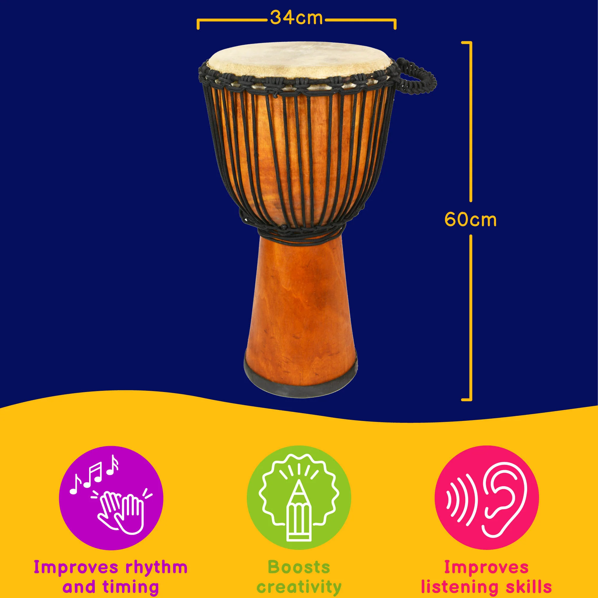 The djembe is one of the world’s most popular drums that is now a mainstay within schools and education, promoting the sounds and cultural diversity of African and world music. A-Star djembes are traditionally handmade using high-quality solid wood and featuring natural goatskin heads and rope tuning.