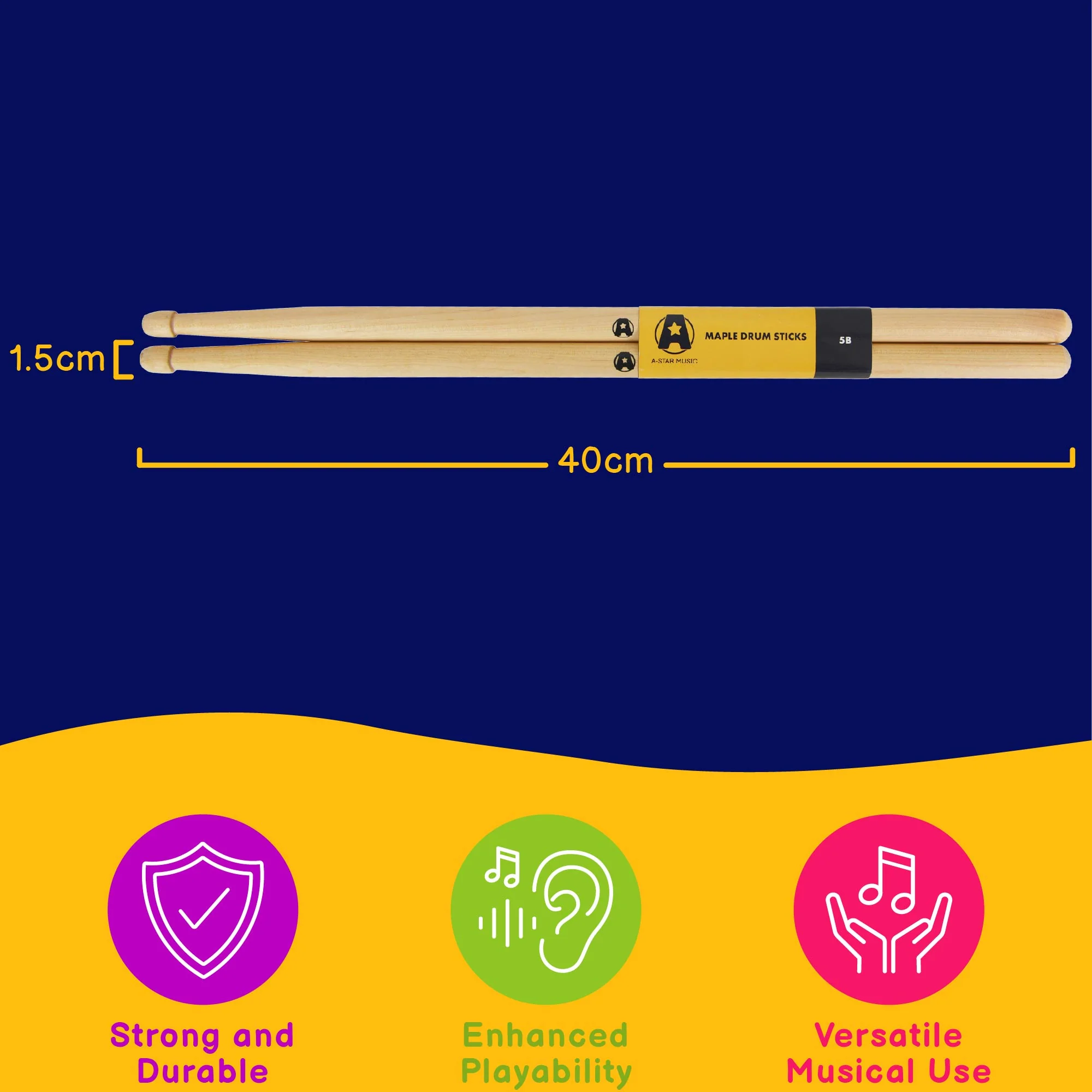 A-Stars 5B Maple Drum Sticks are the perfect all-rounder, sturdy for the hard hitters as well as those focused on more subtle tones. Crafted from maple, they offer better stick rebound than heavier hickory-made models and the lightweight construction enables faster playability.
