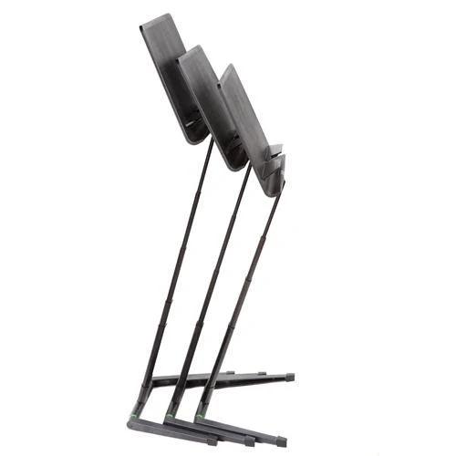When unfolded, the Jazz stand is adjusted by raising or lowering it to the desired height and leaving it there. Its friction joints ensure that it stays at the right height. The tray has an additional shelf for pencils and small instruments. Friction locks automatically hold the tray at whatever angle you set. There are no knobs to fiddle with or lose, and it will never go slack. Pull the telescopic stem to the height that you need, turn the music tray around and twist the base until it's flat on the floor.